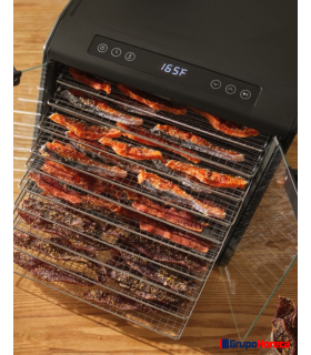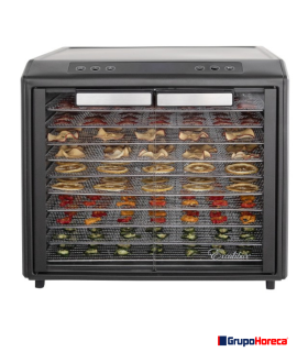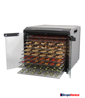 Cuerpo de acero inoxidable con doble capa aislante, nos asegura su rendimiento térmico con un bajísimo consumo. Las 10 bandejas de rejilla están fabricadas en acero inoxidable, son un poco más amplias que los modelos en plástico, admiten algo más de 1,40 m2 de superficie de deshidratación. Permite alternar su colocación con alturas regulables, de fácil limpieza, sin olores, altamente silencioso, con 2 puertas de cristal de seguridad y con apertura a 90º que nos permiten cargar y descargar con plena comodidad. Gracias a su sistema de reparto de calor Excalibur Parallex™ (Horizontal Air Flow) asegura un perfecto deshidratado, Ahora con una hélice más eficaz. Control de temperatura digital con mejor estabilidad y hasta 99 horas programables de trabajo. Puede programar ciclos de deshidratación con dos diferentes temperaturas, permitiendo temporizar una temperatura más alta al principio del secado, y una más baja en un segundo momento para conferir una textura óptima al producto final.