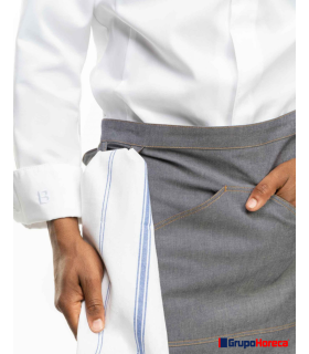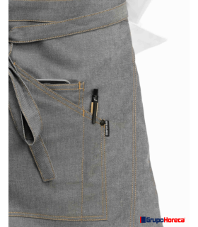 Delantal Vaquero Gris Acero para Hombre o MujerDelantal mixto. Cintura de anudar. Pespunte naranja. 1 bolsillo lateral y 3 bolsillos delanteros. Tela vaquera de Color Gris Tejido: 55% Algodón 45% Poliester